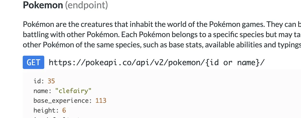 Dans nos données on nous renvoit pokemon species, qui ne contient pas les informations nécessaire. En regardant dans la documentation on peut voir qu'il existe une requête dédié aux fiches pokémons, qui demande un id ou un nom: