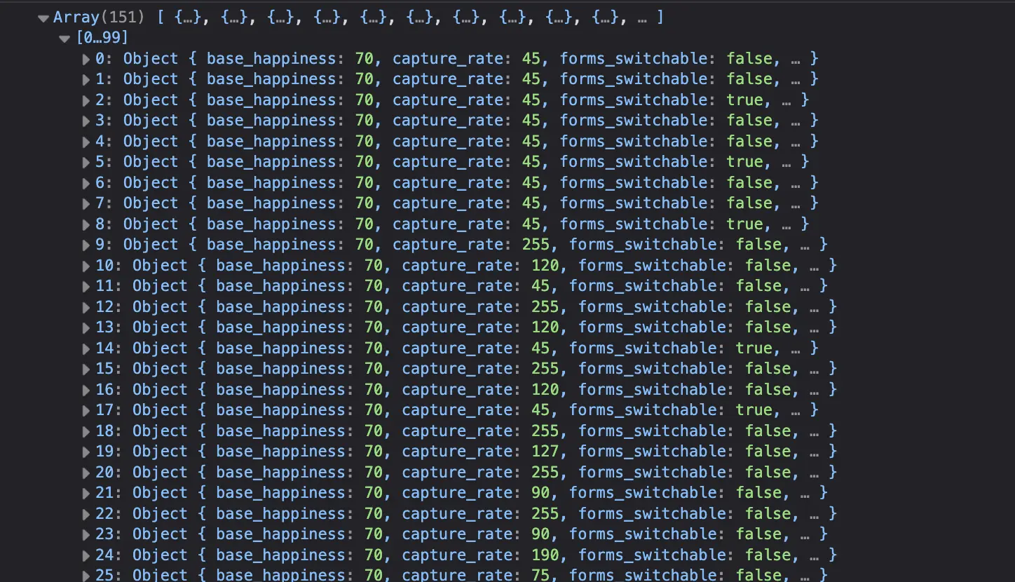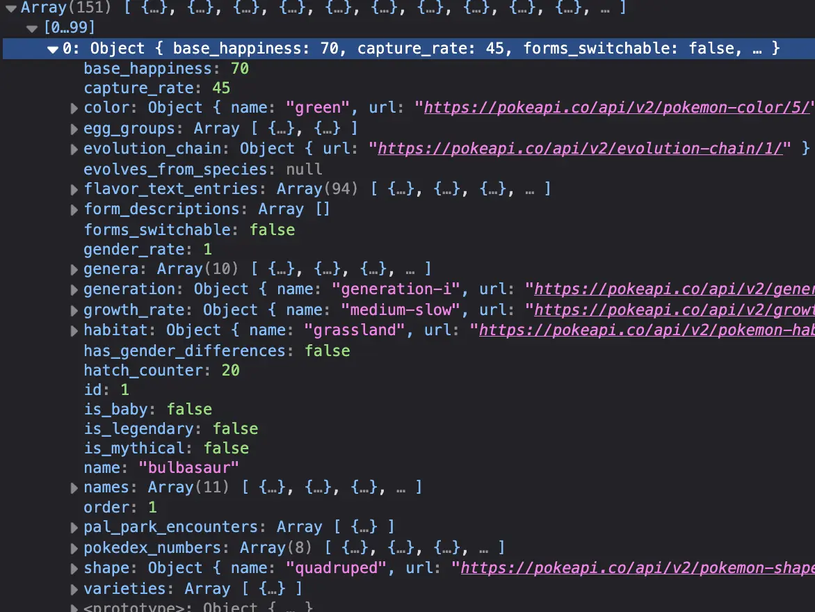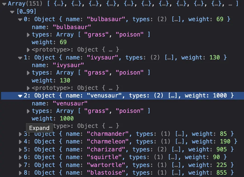 Vu le nombre d'éléments (151) et la longueur des données, il serait bon de créer notre propre tableaux avec uniquement les données qui nous intéressent: name, types, weight.