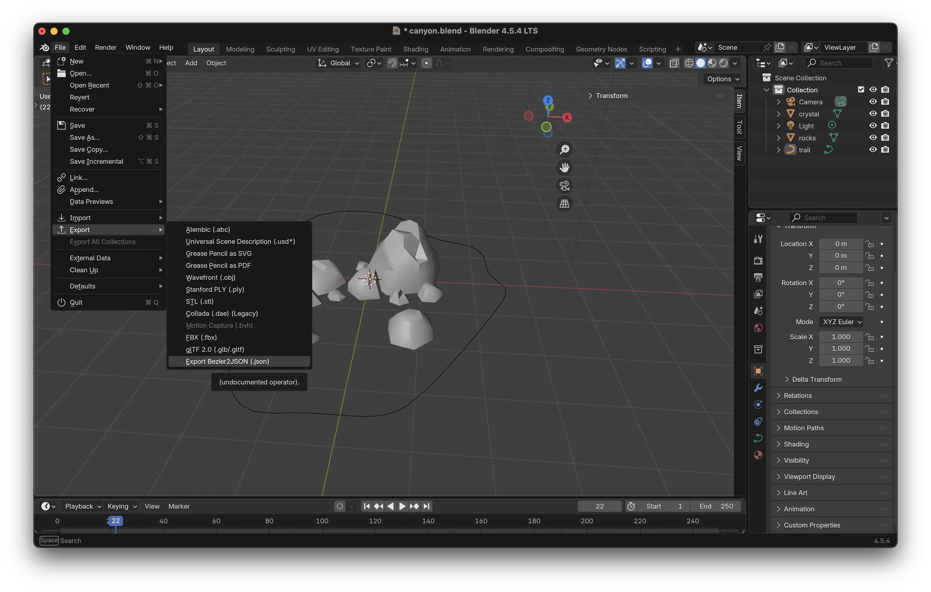 Grâce à cette extension, nous pouvons maintenant exporter les données de notre courbe au format JSON. Depuis l'onglet File > Export > Export Bezier2JSON.