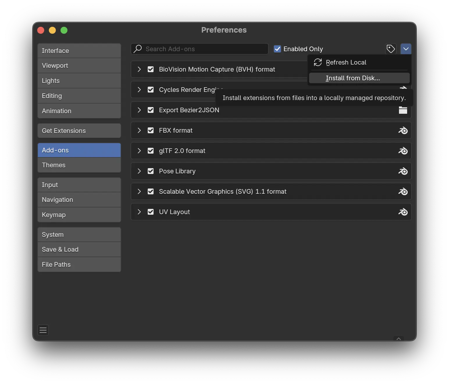 La première chose à faire est d'installer Bezier2JSON depuis l'onglet Edit > Preferences… > Add-ons.