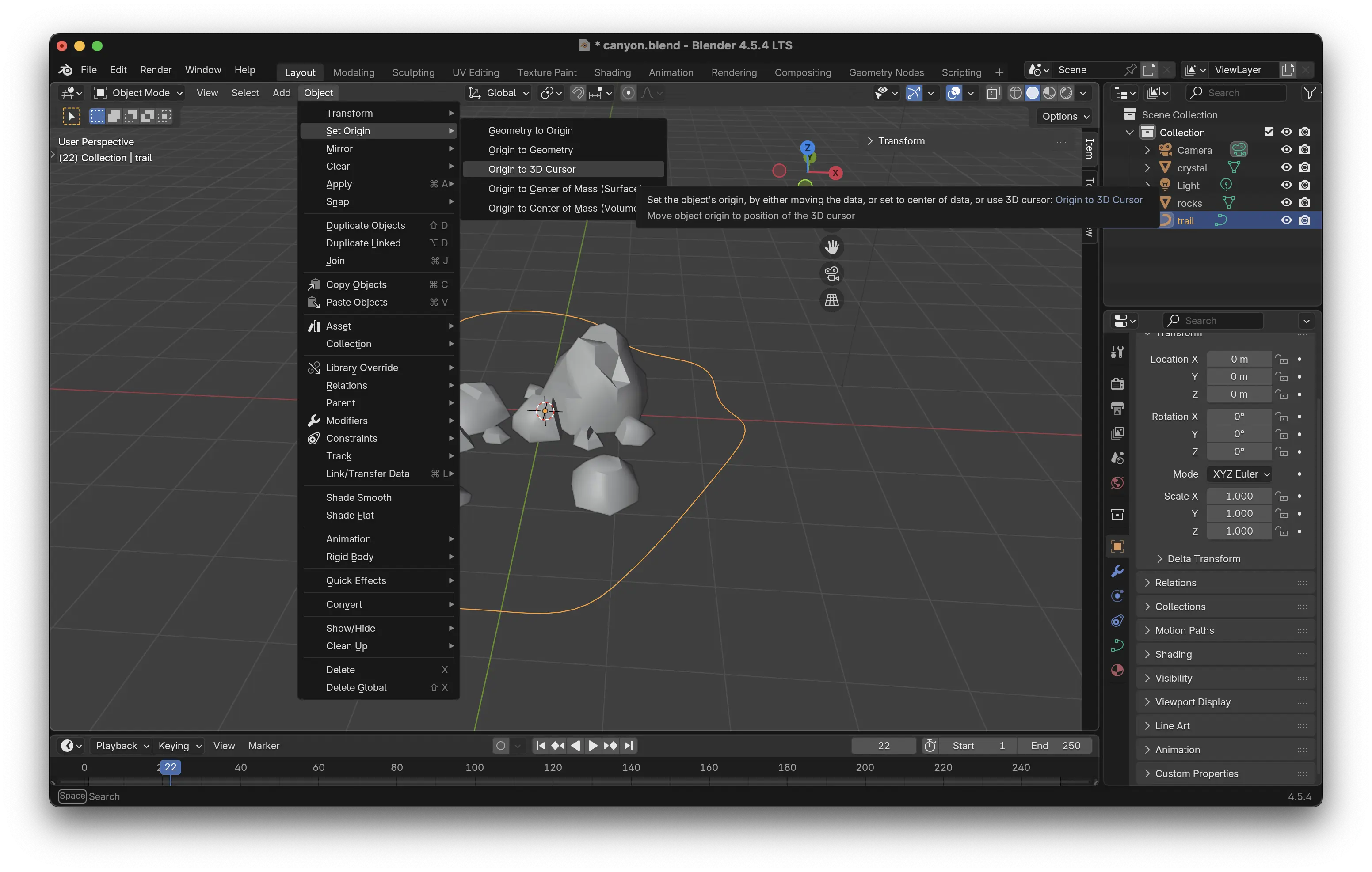 Un autre point important est de redéfinir l'origine de la courbe pour éviter des décalages lors des différents exports. Après sélection, toujours dans le menu Object se trouve le sous-menu Set Origin l'option Origin to 3D Cursor.