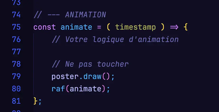 La section animation met en place une fonction qui peut être appelée avec requestAnimationFrame (ou raf). Votre logique d'animation se situera à cette endroit. Attention de ne pas modifier les 2 dernières lignes.