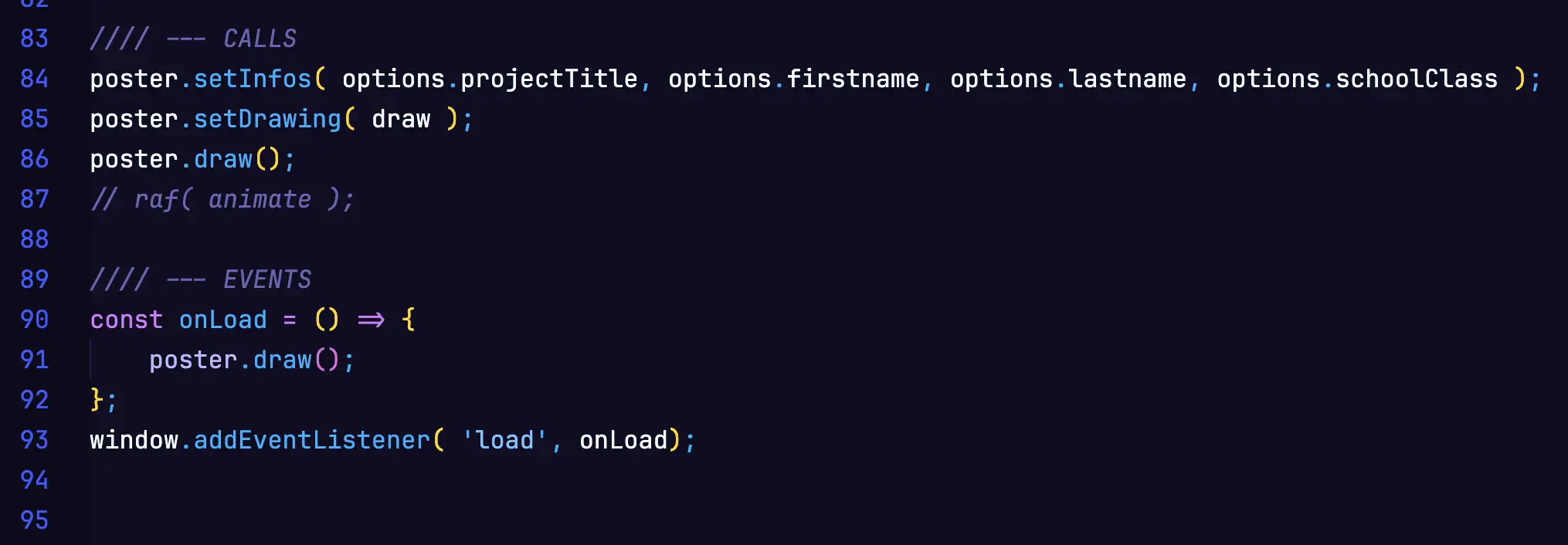 Les section calls et events appellent les fonctions nécessaires. Vous n'avez rien à modifier ici sauf à décommenter/commenter la ligne suivante si vous avez des animations: