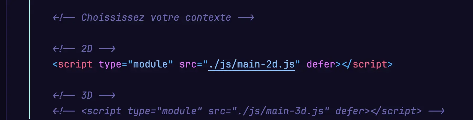La première chose à faire est de choisir votre context, 2d ou 3d et d'activer dans le fichier index.html la balise script correspondante :
