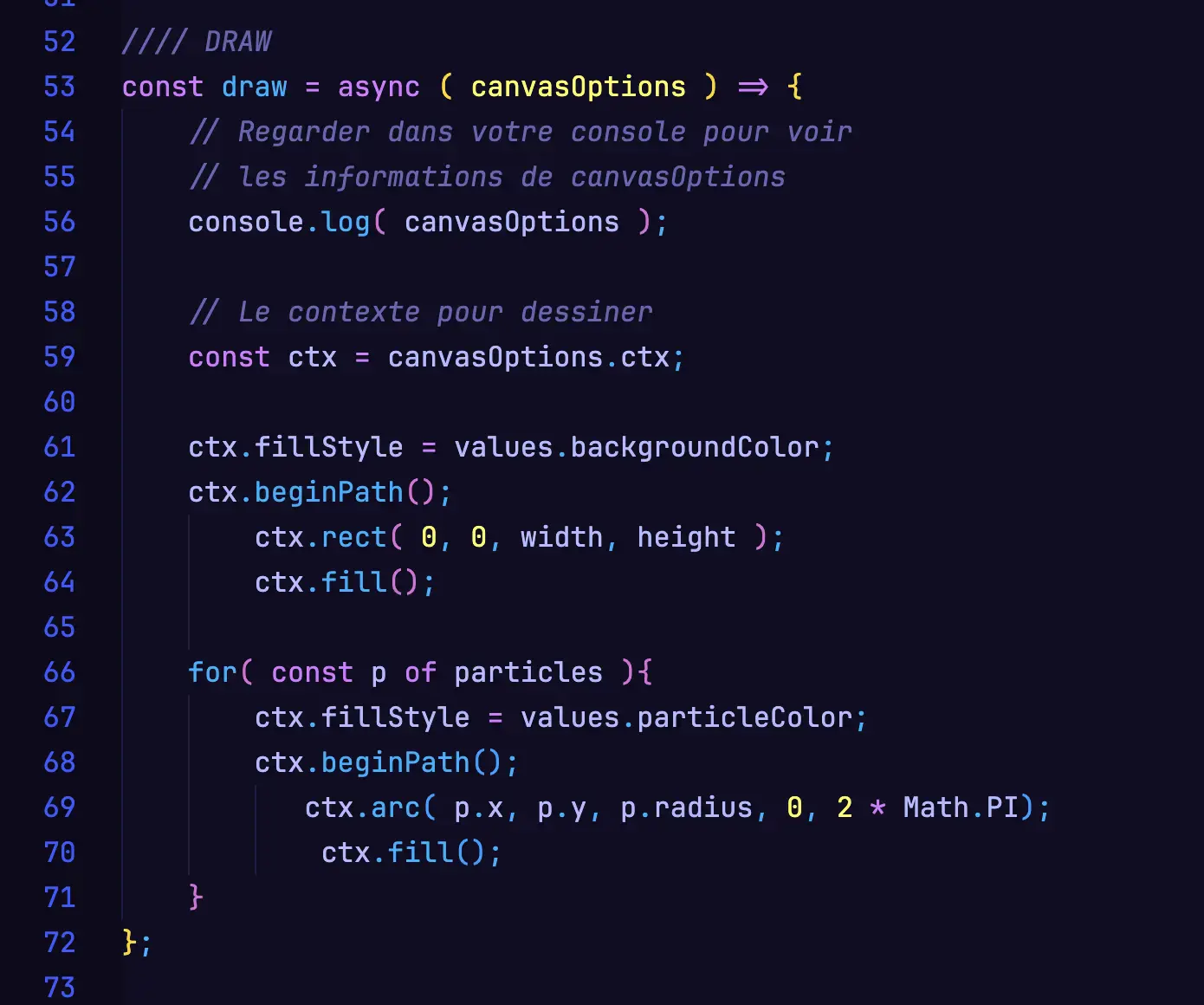 C'est ici que vous allez écrire votre logique de dessin, dans la fonction draw. À l'intérieur de cette fonction, vous avez accès à une variable canvasOptions qui contient des informations qui dépende de votre contexte (2d ou 3d);