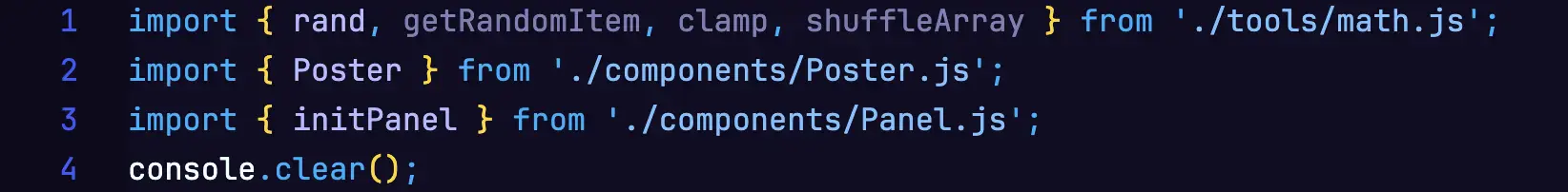 Vous verrez dans ces 2 fichiers des imports, qui donne accès aux fonctions qu'on a déjà utilisé pendant les cours ( rand, getRandomItem, clamp, shuffleArray ) et à certaines librairies comme Tweakpane, Chroma.js et Three.js.