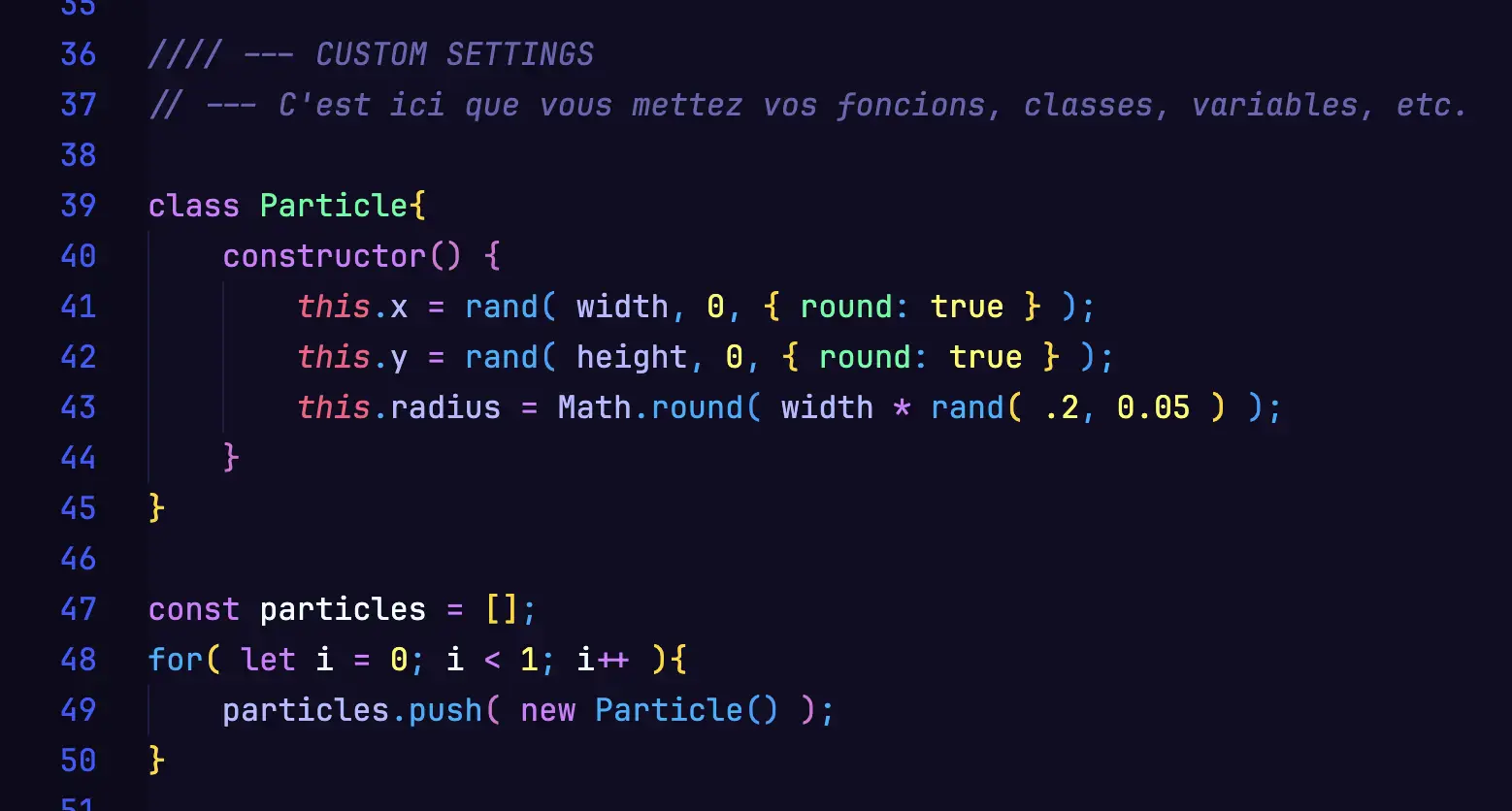 C'est dans cette section du code que vous placerez vos classes, fonctions, autres variables, etc. nécessaires au bon fonctionnement de votre jeu de particules.