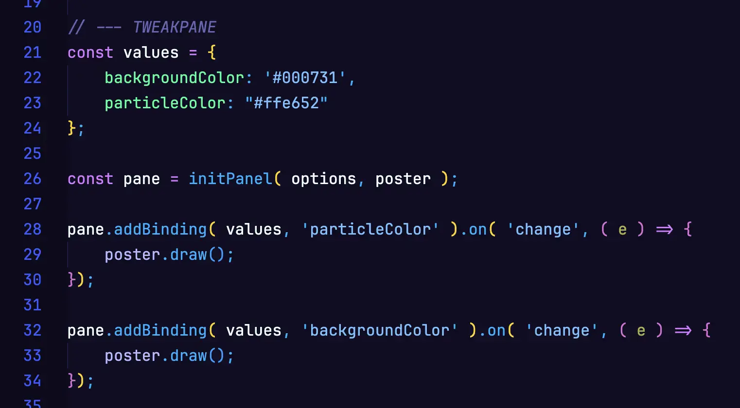 Une section Tweakpane est à votre disposition avec des exemples et une constante values qui n'attend que d'être remplie de données à modifier.