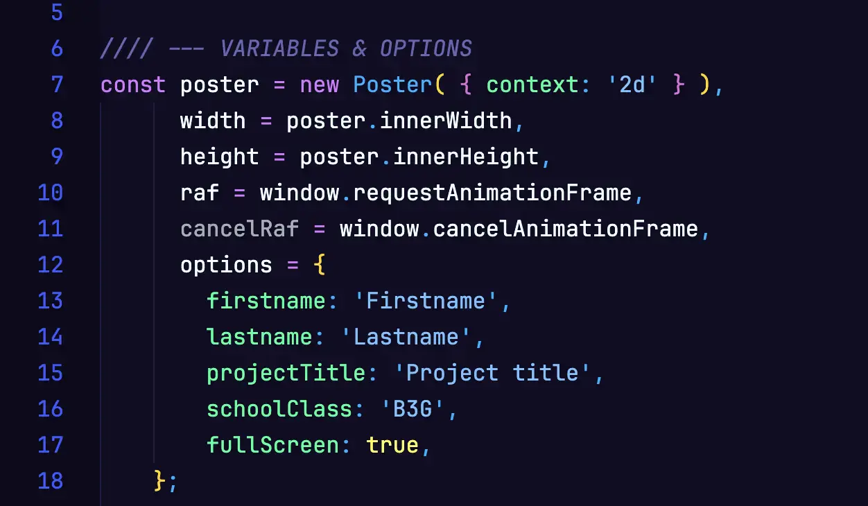 Dans ces 2 fichiers vous trouverez une section variables & options, où on défini les constantes width et height qui sont liés à la taille de votre canvas.