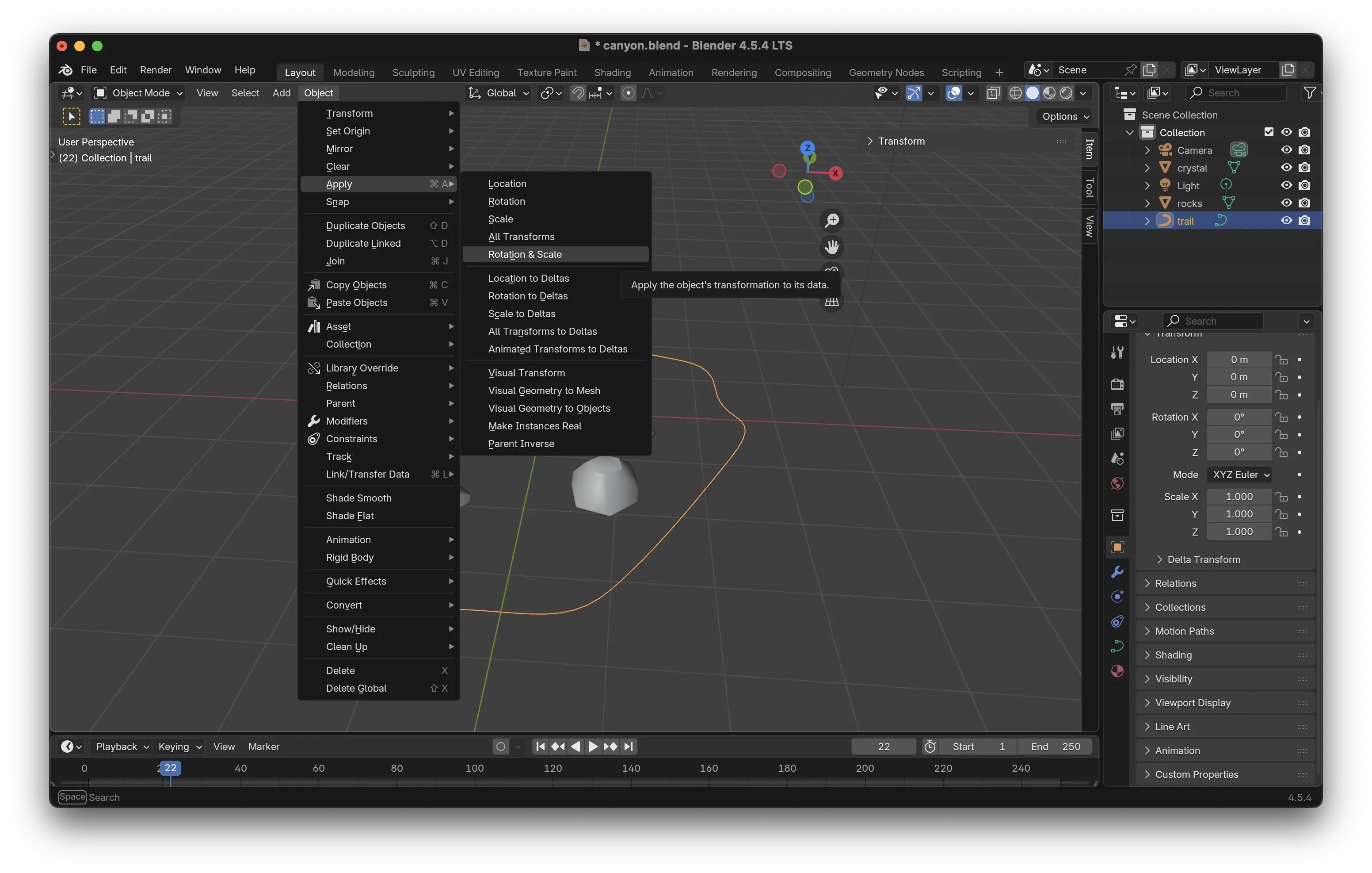 Certaines transformations comme scale, rotation ou location sont définies dans blender lors de la manipulation des éléments. Pour s'assurer une transition sans encombre, il faut les appliquer. En sélectionnant un élément, on trouvera ensuite dans le menu Object l'option Apply avec plusieurs possibilités :