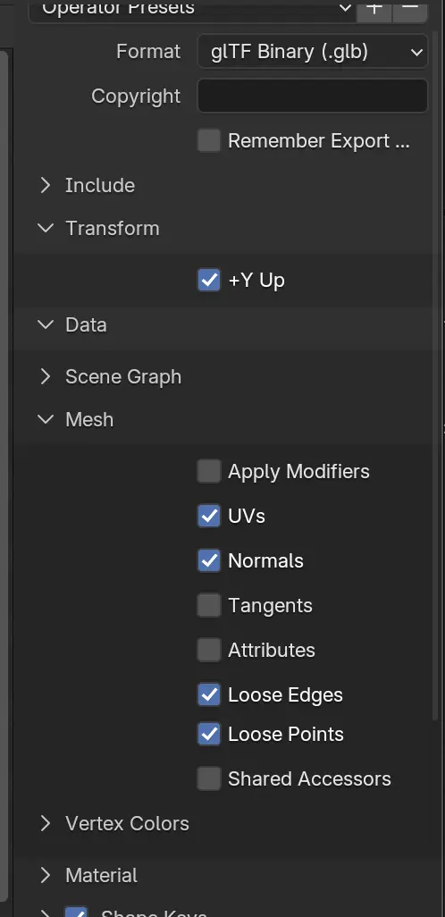 - cocher les bonnes options d'exportation en glTF