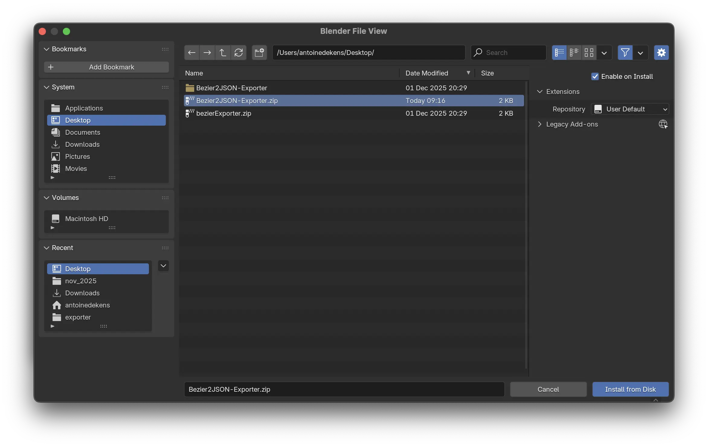 La première chose à faire est d'installer Bezier2JSON depuis l'onglet Edit > Preferences… > Add-ons.