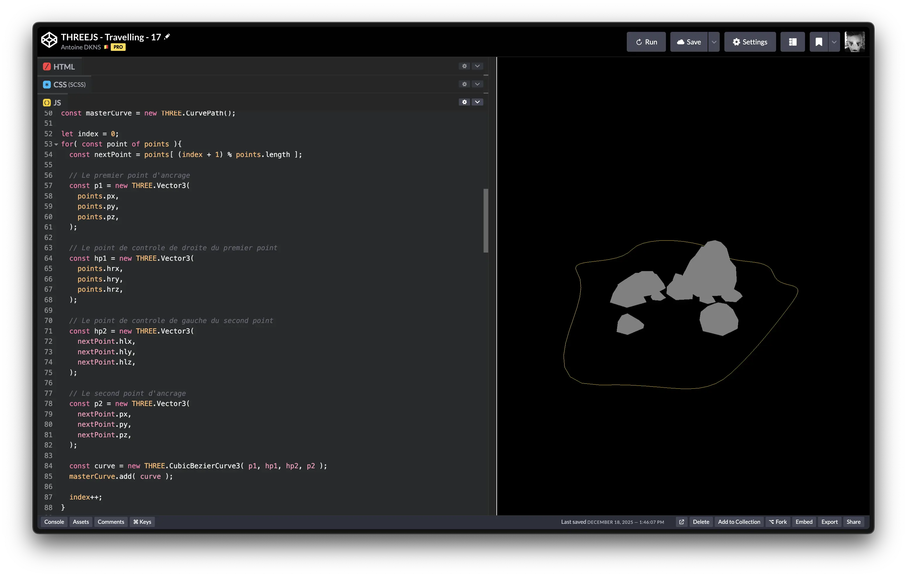 Pour recréer la totalité de la courbe, nous allons devoir combiner chaque segment qui l'a compose dans un CurvePath. On y ajoutera chaque pair de points, sous la forme d'un CubicBezierCurve3.