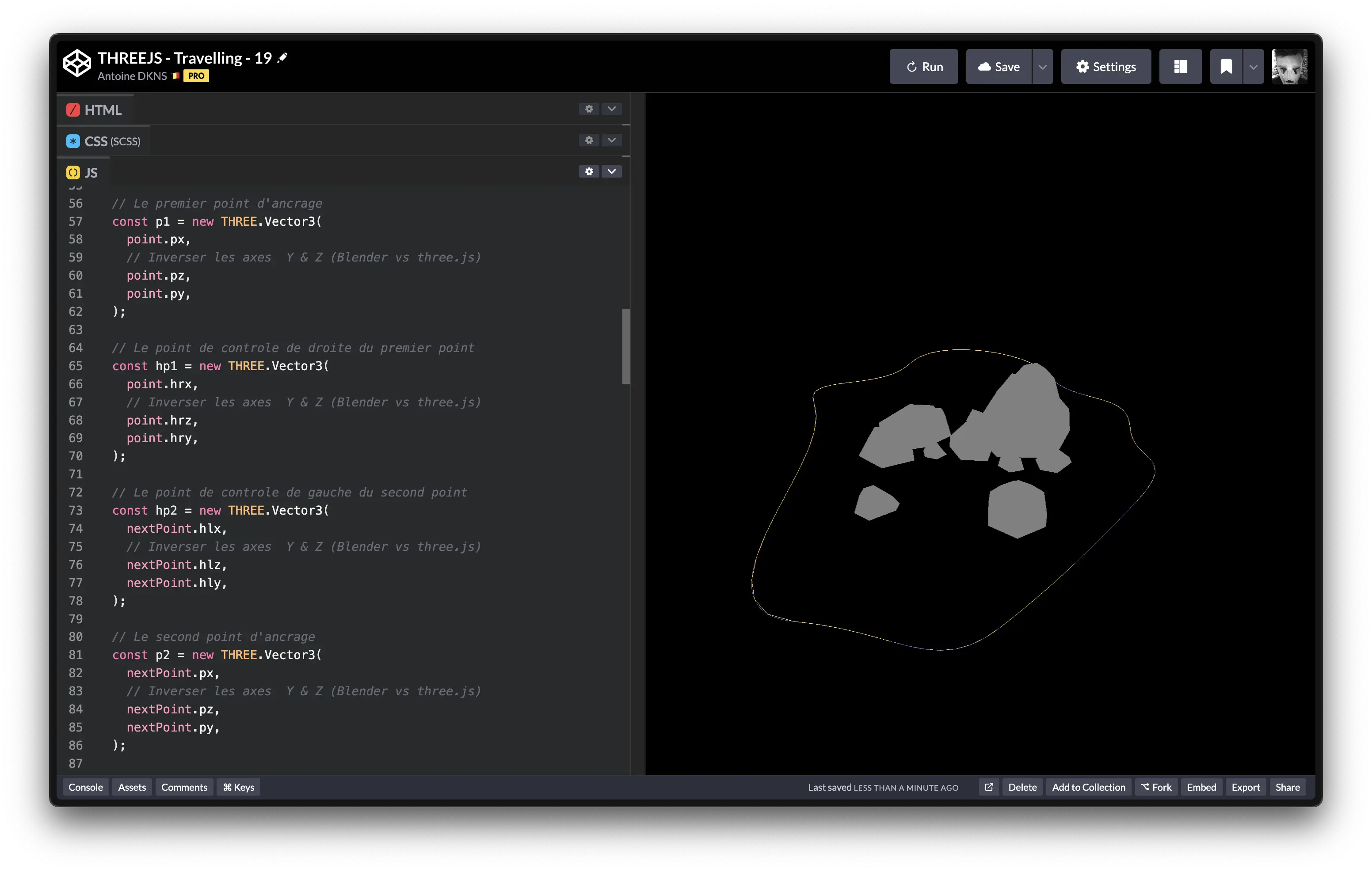 Problème : notre courbe semble tournée à 90 degré. Avant de s'arracher les cheveux, n'oublions pas que Blender et three.js n'ont pas les mêmes axes. Il suffit de remplacer l'axe Y par le Z dans la création de la courbe :