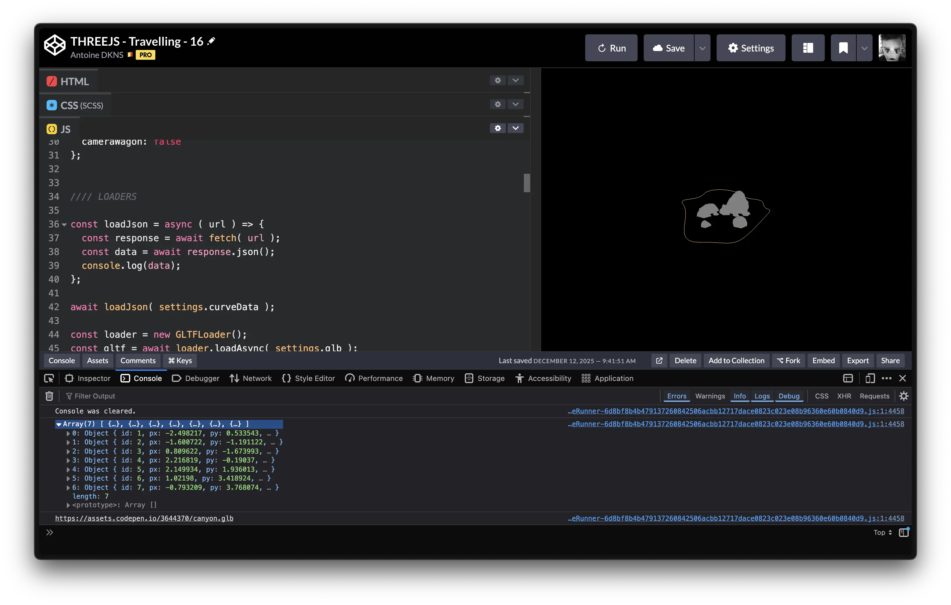 Pour impoter la scène dans notre projet, il faut ajouter l'extention GLTFLoader. Ensuite nous pourrons charger notre fichier .glb :